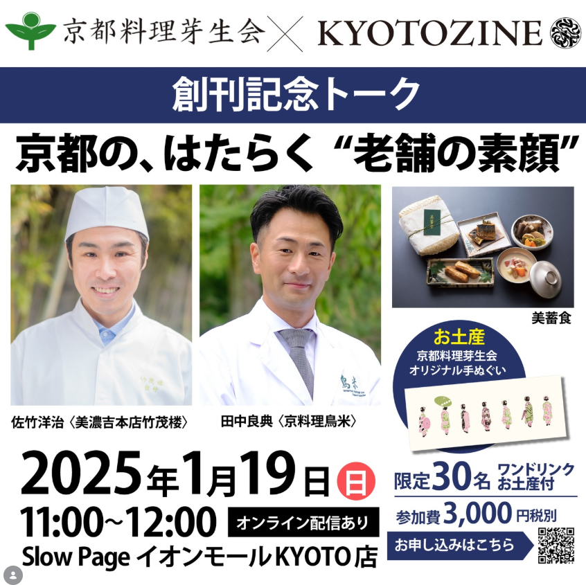 雑誌『KYOTOZINE』創刊記念としまして、京都料理芽生会会長の佐竹洋治(美濃吉本店竹茂楼)と副会長の田中良典(京料理鳥米)がトークイベントを行いました。