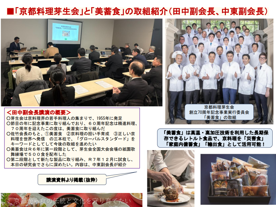 2026.01.30 2026.02.24 admin コメント: 0 「和食情報交換会」開催~「美蓄食」が拓く食の未来 記事一覧 「和食情報交換会」開催~「美蓄食」が拓く食の未来 令和8年1月30日(金)14時~16時 主催者:京都料理芽生会 関西文化学術研究都市推進機構(学研フードテックPF事務局)で行われました。 この記事のタイトルとURLをコピーする 雑誌『KYOTOZINE』創刊記念トーク 『美蓄食』芽生会レストラン in京料理展示大会 関連記事 『美蓄食』芽生会レストラン in京料理展示大会 備蓄食の研究開発 第一回「備蓄食に重要なこと」 雑誌『KYOTOZINE』創刊記念トーク 京の食文化の進化 関西パビリオン コメント コメント ( 0 ) トラックバック ( 0 ) この記事へのコメントはありません。 この記事へのトラックバックはありません。 トラックバック URL 返信をキャンセルする。 名前 ( 必須 ) E-MAIL ( 必須 ) ※ 公開されません URL